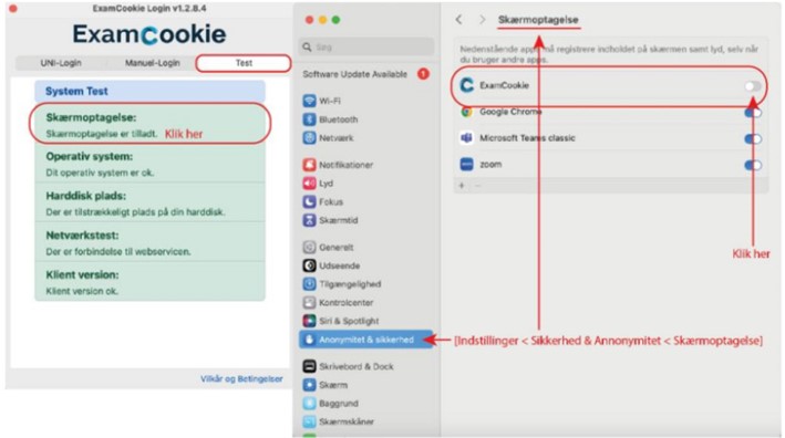 Du skal give tilladelse til monitorering af skærm samt aflæsning af browser URL i sikkerheds og anonymitets indstillinger. Det gør du ved at trykke tillad i pop-up beskeden eller klikke på ExamCookie ikonet i de indstillinger, der automatisk åbner, når du starter ExamCookie.