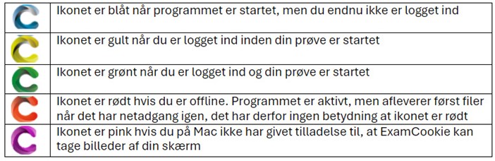 ExamCookie-ikonet kan blive vist på din skærm og kan have 5 forskellige farver, som betyder følgende: